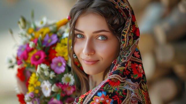 A beautiful Azerbaijanian woman holding a bouquet of flowers in her hand.