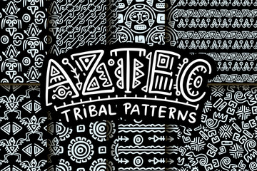 Ethnic Aztec cards, backgrounds set. Ancient Mexican tribal symbols, elements, lines, abstract patterns, navajo ornaments. Hand-drawn interior posters, wall art. Flat graphic vector illustrations