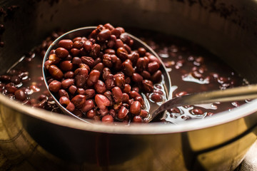 Red bean paste a sweet filling made from azuki beans is a delicious ingredient commonly used in Asian desserts. Creative banner. Copyspace image
