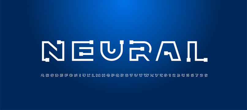 Technology font, digital cyber alphabet made future space style, letters A, B, C, D, E, F, G, H, I, J, K, L, M, N, O, P, Q, R, S, T, U, V, W, X, Y, Z, numerals 0, 1, 2, 3, 4, 5, 6, 7, 8, 9 made line