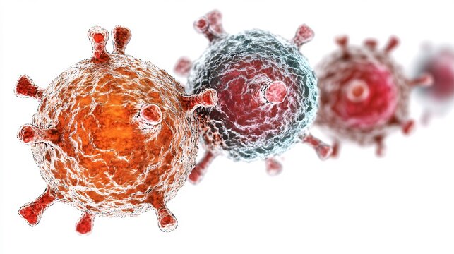 High detail scientific visualization of immune cell like T cell B cell macrophage interacting pathogen vibrant immunological response sterile 3D space white background no text suitable medical