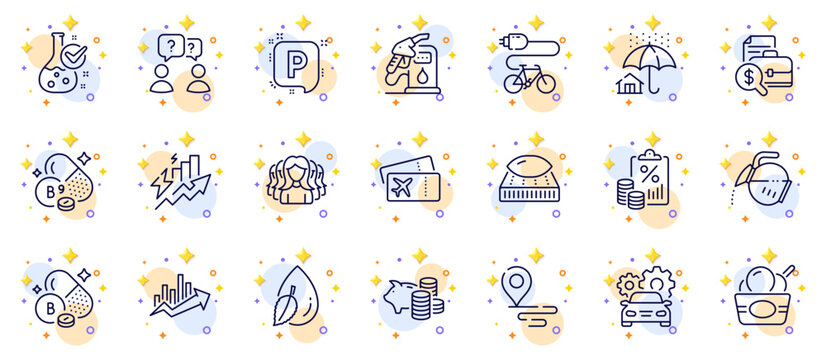 Outline set of Boarding pass, Growth chart and Coffee pot line icons for web app. Include Parking, Chemistry lab, Accounting report pictogram icons. Consumption growth, Home insurance. Vector
