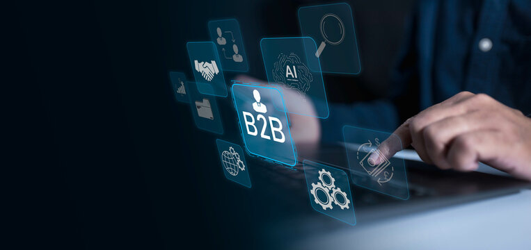 Businessman Highlighting B2B Operations on a Futuristic Digital Interface, Ideal for Technology and Business Presentations