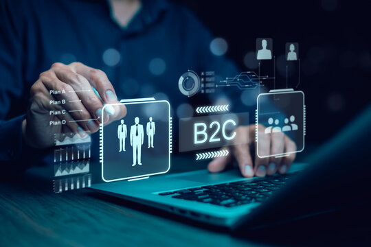 B2C business to consumer concept 2025 on virtual screen.Business to customer marketing strategy.business to client marketing and internet services. communication, feedback, online marketing.