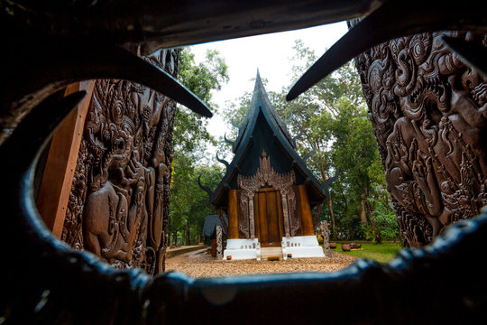 Black Temple, Baan Dam, in Chiang Rai,Thailand, provides collection of skins, bones, teeth of animals.Popular tourist place.Wooden house gold facade.Carved painted wood.Thai style house decor.