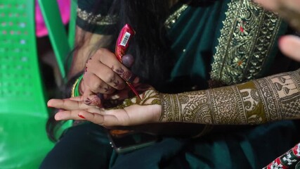 Skilled artist meticulously applies intricate traditional mehndi on a persons hand during an indian wedding ceremony.