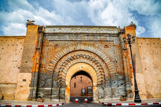 City gate Bab Agnaou with stork nests. Marrakech, Morocco.