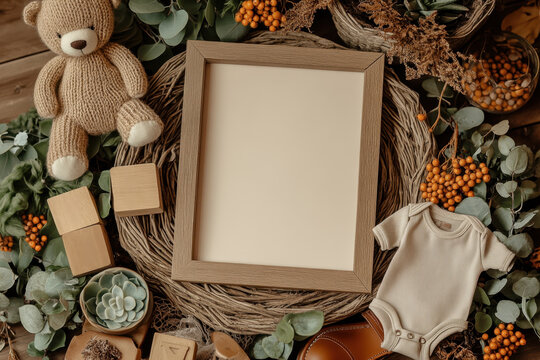 A rustic and cozy baby announcement setup for a baby boy with a wooden framed blank plaque in the centre with room for copy space