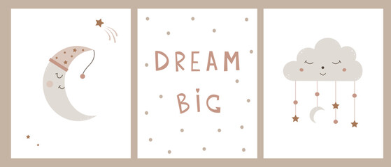 Cute baby posters with a sleepy moon, fluffy cloud and lettering big dream. Vector illustrations baby shower, postcards, textiles. Wall art nursery. Abstract sky with stars, moon and cloud.