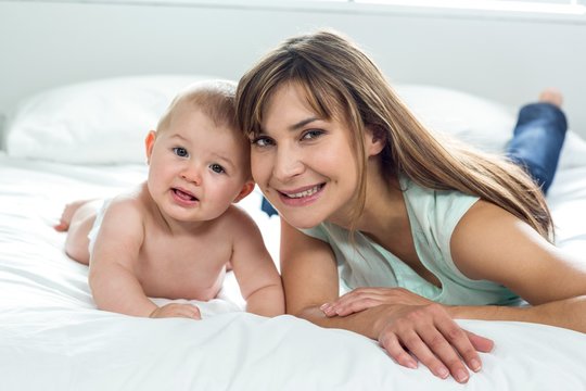 Mother and cute son lying on bed