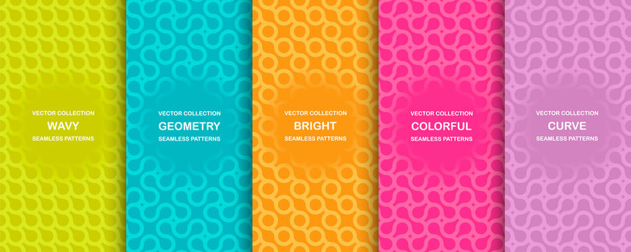 Set of bright vector colorful seamless geometric wavy patterns - creative design. Vibrant curly backgrounds, endless curve textures