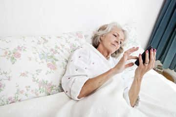 An old vibrant lady vibing on music while wearing headphones with copy space, old people adopting to technologies