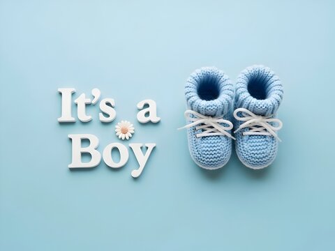 baby shoes on a white background, Composition featuring text Its Boy with small blue crochet baby booties and flower decor on light blue background. Newborn arrival announcement card idea. Concept of