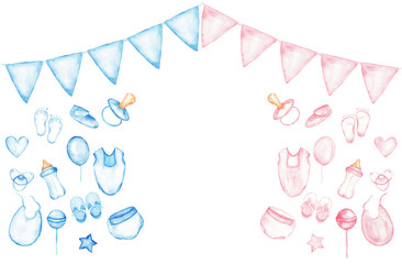 Gender reveal party horizontal banner with blue and pink decorations for event design. Template for baby shower, baptism, boy or girl party. Watercolor illustration. Isolated. Hand drawn. Copy space