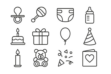 Newborn Party Icons. Newborn party. Line icon set of Newborn party: pacifier, baby rattle, diaper, baby bottle, cake, gift box, balloon, party hat, candle,