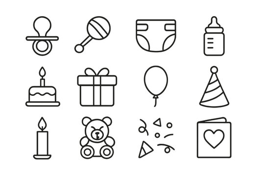 Baby Icon Set with Outline Style, Newborn Congratulations Symbols Including Baby Rattle, Pacifier, Baby Carriage, Teddy Bear, Baby Bottle, Onesie Vector Illustration for Parenting and Infant Care