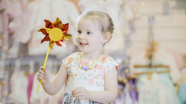 fancy dresses for girls. baby in a white, lush, elegant dress near the hanger with festive clothes. fashion for children. shop.