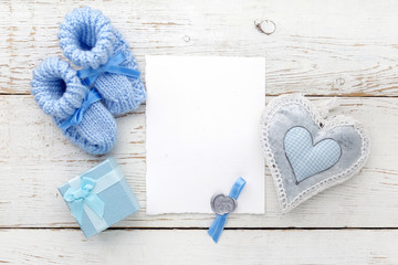 Baby booties with a blank card and heart on a white wooden background. Top view