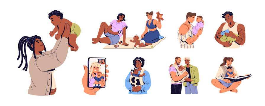 Set of parents with babies. Mothers, fathers hold infants, play with kids, care about newborns. Diverse happy families spend time together. Flat isolated vector illustrations on white background