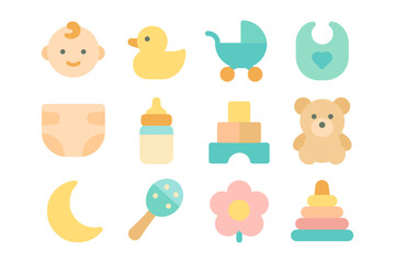 Baby essentials vector illustration set: flat style design for nursery decor and kids products