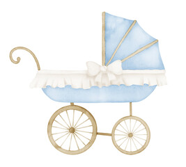 Watercolor Baby Pram in vintage style. Retro kid Stroller in cute pastel blue and beige colors. Carriage for children on isolated background. Hand drawn illustration of perambulator for newborn party