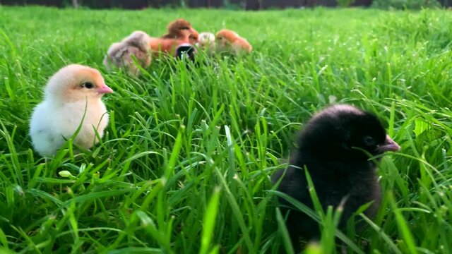 black Chickens in grass on farm. Little colorful chicks walk in nature. hens brown and yellow. Close up newborn poultry chicken beak field. adorable little chick design and decorative. Easter concept