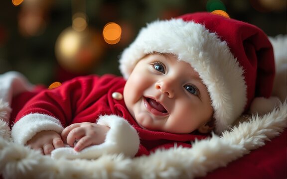 adorable little baby boy in a red christmas outfit sitting on a soft fake fur in front of a christmas tree