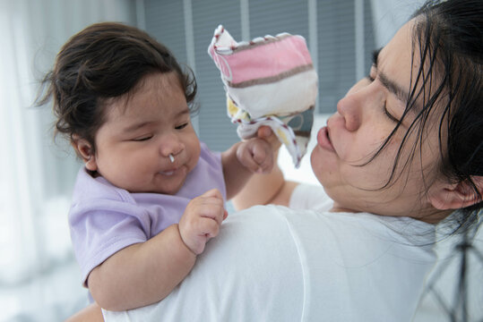 A mother holds a baby who has milk coming out of his nose because he choked on excess milk while holding him.