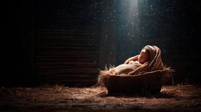 A newborn baby lies quietly in a basket made of straw wrapped in cloth illuminated by soft light coming down from above. The setting is dark and rustic.