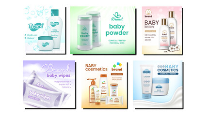 Baby Cosmetics Promotional Posters Set Vector. Shampoo And Gel, Lotion And Cream, Wet Wipes And Powder Baby Cosmetics Blank Packages Collection Advertise Banners. Style Concept Layout Illustrations