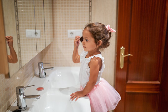 little girl putting on makeup in front of the bathroom mirror