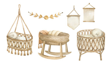 Watercolor illustration with cute furniture for children in boho style. Nursery decoration, cradle, bed, decor, basket, baby bed. Decor for children room isolated on white