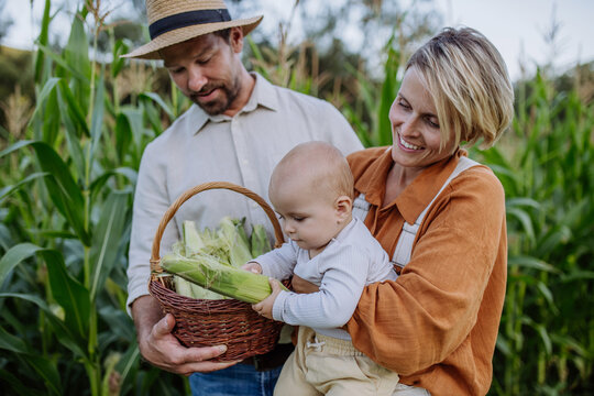 Portrait of parents with beautiful baby harvesting corn on the field.