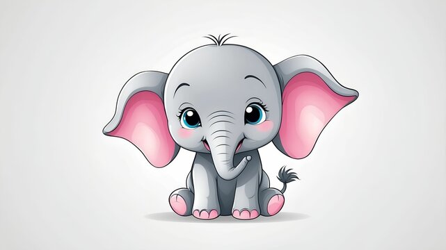 A cute cartoon baby elephant with big blue eyes and pink ears sitting on a light background