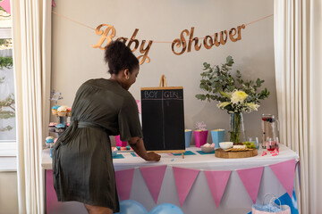 Mid-adult African American woman arranging baby shower table in dining area with cupcakes, banners