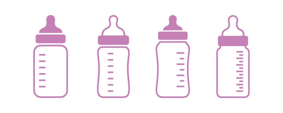 Mother feeding baby with a bottle, set of three illustrations outline, silhouette and color drawing