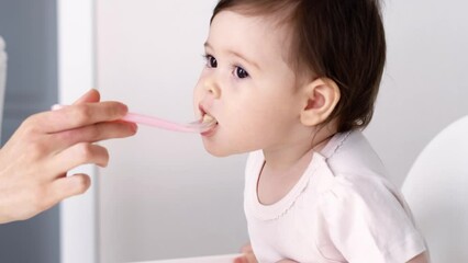 Baby girl eating blend mashed food sitting, on high chair, mother feeding child, hand with spoon for vegetable lunch, baby weaning, first solid food for young kid.