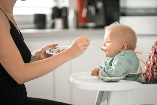 Mother spoon feeding her baby boy child in baby chair with fruit puree in kitchen at home. Baby solid food introduction concept.