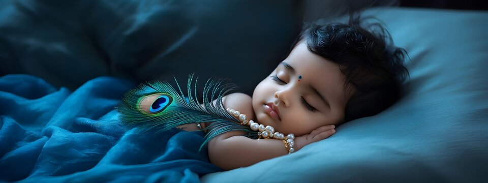 Cute little sleeping baby Krishna with peacock feather. Hindu god Lord Krishna. Krishna Janmashtami, Govardhan Puja. Indian religious festival