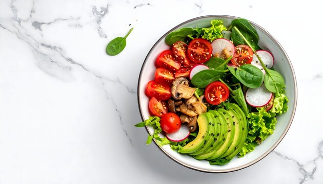 Fresh Avocado Salad with Cherry Tomatoes, Mushrooms, and Spinach, vegan & vegetarian food with space