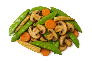 Fresh stir-fry vegetables with button mushrooms, snow peas, baby corn, and carrot slices, ready for healthy cooking