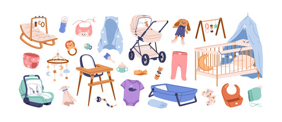 Baby care tools. Toy supplies. Child gear accessories. Kid stroller. Newborn nanny or babysitter. Toddlers breast pump. Rattle and bottle. Bath and ball. Vector infants clothes set