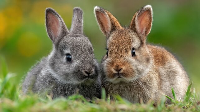 Two adorable bunnies side by side in the grass, gazing toward the viewer. One has a grey coat and the other a brown one. Their attentive expressions reveal a hint of curiosity