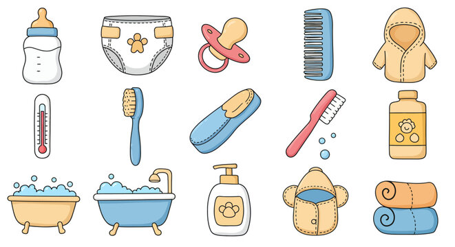 Baby shower hand drawn set. New baby items and icons. Cute doodle illustrations including teddy bear, baby clothes, bib, bottle, cloud, bunting banners, diaper, stork.