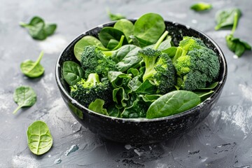 Young boy holding a bowl of fresh cooking herbs and leafy green vegetables with copy space.