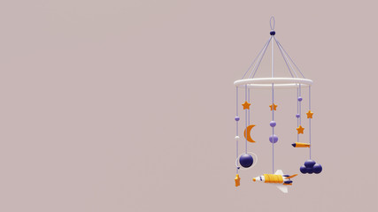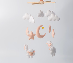 Baby crib mobile with stars, planets and moon. Kids handmade toys above the newborn crib. First baby eco-friendly toys made from felt and wood. Space for text.