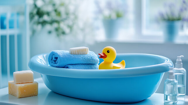 eco-friendly baby bath products, including a bamboo bath brush and organic cotton towels, with rubber ducks and bath toys for a fun bath time