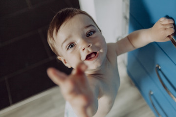 Asian 18 months / 1 year old toddler baby boy standing on tiptoes at home, Kid reaching up try to open / close door knob, Child want to escape to play, explore outdoor, Security and Safety Concept