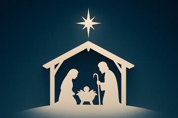 Nativity silhouette art depicting the holy family, Joseph, Mary, and baby Jesus under the guiding star of Bethlehem
