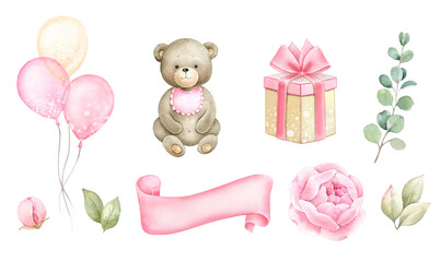 Newborn Baby girl clipart set.Little bear,air ballons,gift boxes,banner,flowers for baby shower invitations.Watercolor illustration isolated on white background..